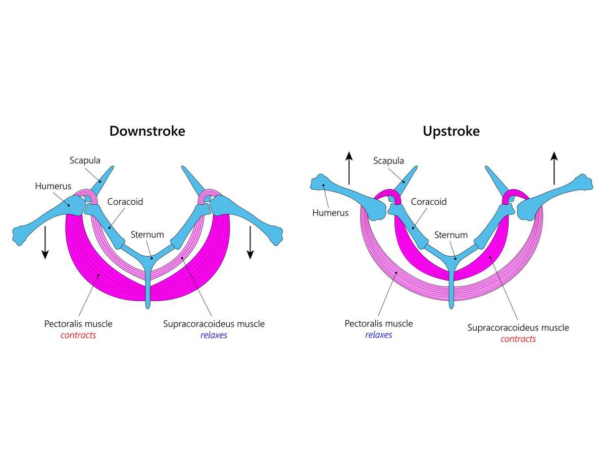 Two large muscles drive the wing through its flapping cycle. The pectoralis major, anchored to the keeled sternum, pulls the wing downward on the power stroke. The supracoracoideus, running through a pulley-like notch in the coracoid bone, lifts the wing on the recovery stroke. Together these muscles can account for thirty percent or more of a bird’s total body mass in strong fliers like pigeons.