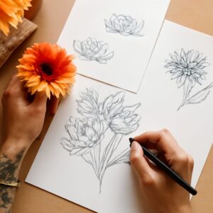 Graphite works well for initial studies because it’s forgiving and allows you to build form gradually. Start with light construction marks, establish the major masses and proportions, then refine with darker marks. Ink or pen-and-wash is a good next step once your pencil study reads correctly — the commitment required by ink forces more deliberate observation and decision-making.